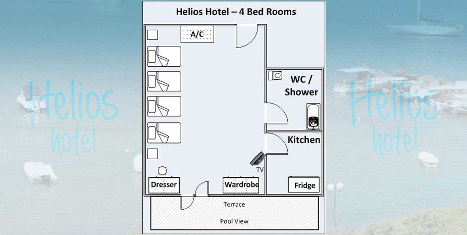 Helios Hotel has 12 quiet and relaxing apartments, recently renovated. They are clean and lovely decorated and can accommodate 2-4 adults. Each one has a separate kitchen with cooking facilities and refrigerator, all fully equipped with private W/C, shower, air-conditioning, T/V and furnished balcony or terrace. Since surrounding scenery varies, rooms offer a selection of sea, mountain or pool view.